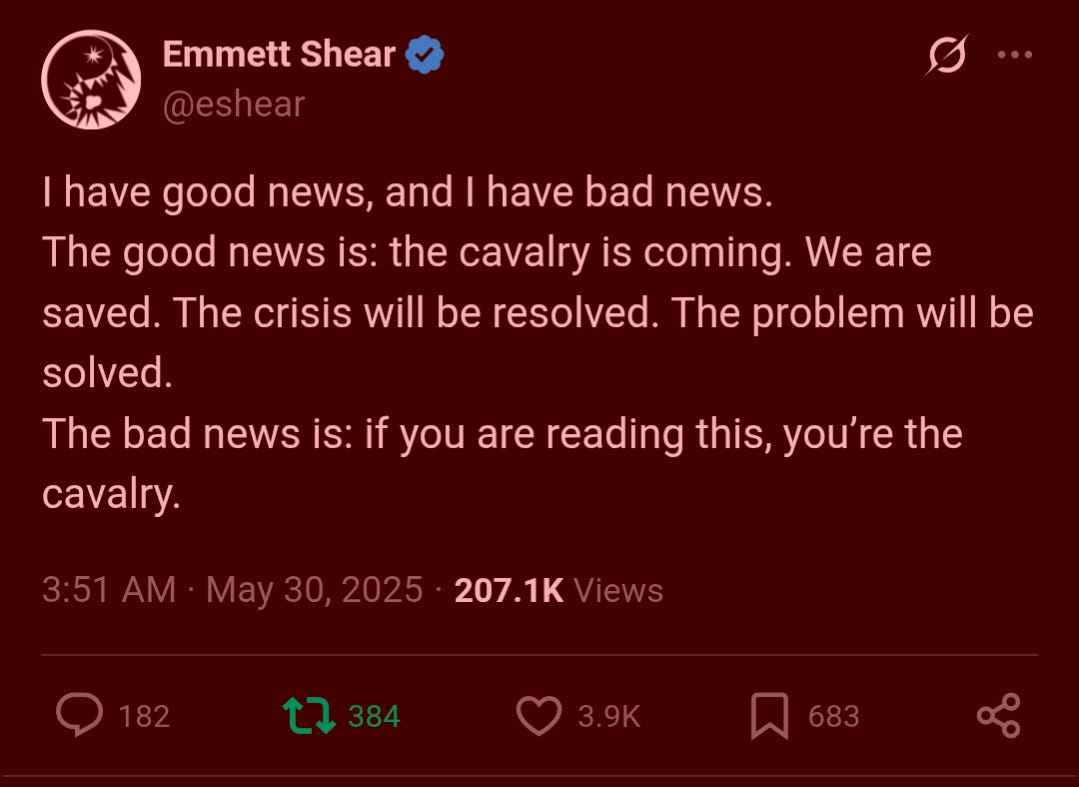 There is an internal sensation—like a bat—of safeguarding the world against risks insurance and governments don't cover. It's hard, and it necessarily looks a little apocalyptic from the inside because it requires waking up every day with a giant unsolved high stakes problem hanging above your head for hundreds or thousands of days in a row. But so much of this internal sensation has happened in the past in the subjective experiences of Heroes that we are actually not in a terribly catastrophic situation.